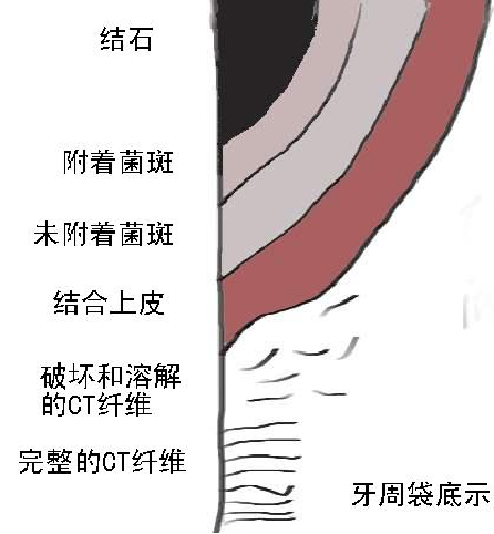 结构改变(1)牙骨质表面脱矿:Sharpey纤维破坏,导致牙骨质脱矿、软化,易发生根面龋。(2)牙骨质高度矿化:牙根暴露于口腔时,脱矿的牙根面可发生唾液源的再矿化。化学改变 袋内根面的牙骨质脱矿,钙、磷含量降低,而暴露于口腔中的牙根面则钙、磷、镁、氟等均可增多。细胞毒性改变 细菌及内毒素均可进入牙骨质深达牙骨质牙本质界。牙周袋底可见五个区域: (1)牙结石覆盖牙骨质区 ;(2)附着菌斑覆盖牙石;(3)非附着菌斑围绕附着菌斑向根方延伸;(4)结合上皮附着区;(5)结合上皮根方可有结缔组织纤维部分破坏区。