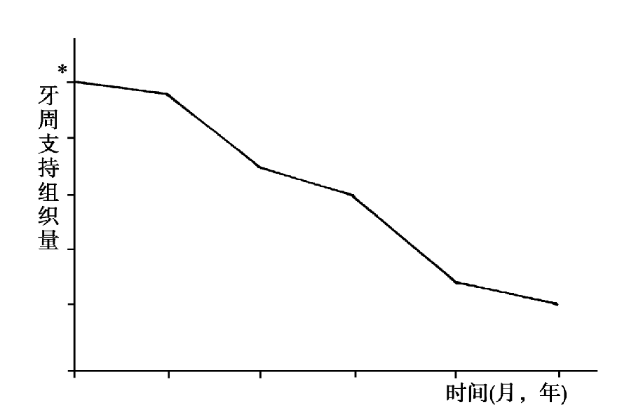 牙周炎病变呈静止期(quiescence)和加重期(exacerbation)交替呈现。静止期:炎症轻,没有或少有骨和结缔组织的附着丧失。活动期:间隔2-3个月,牙周附着丧失大于2mm活动期判断指标:附着丧失大于2mm,龈沟液增多。牙周病持续、缓慢进展的模式牙周病一旦发生,即持续不断地进展,直至牙脱落*附着水平或骨高度