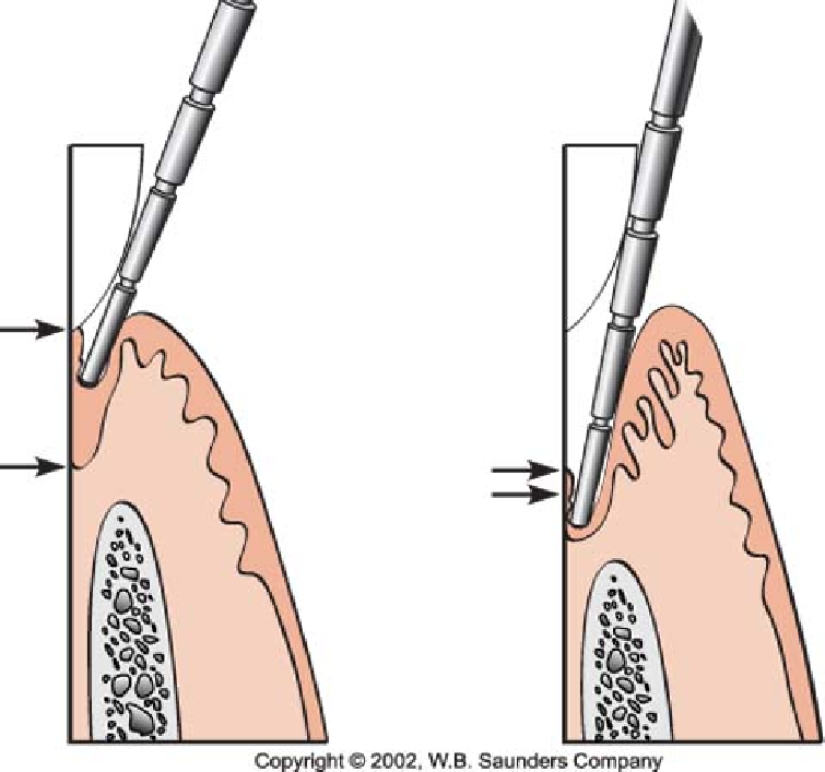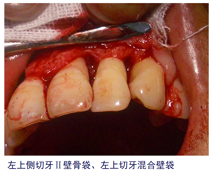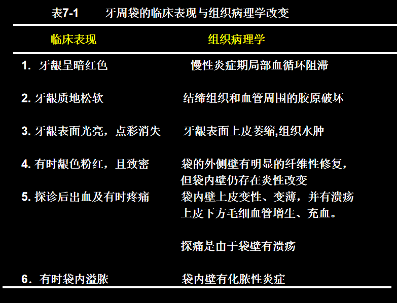 - 袋壁软组织经常受根面龈下牙石的机械刺激,引起袋内出血;
