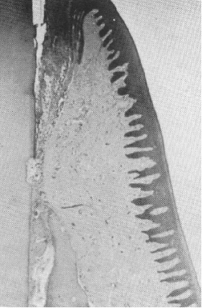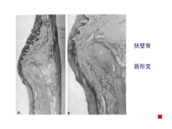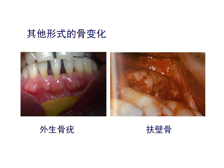4、其他形式的骨变化 由于各部位牙槽骨吸收不均匀,使原来整齐而呈薄刃状的骨缘成为参差不齐。