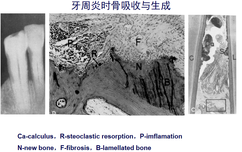 在距炎症中心较远处,可有骨的修复性再生。在被吸收的骨小梁的另一侧,也可见到有类骨质及新骨的沉积。在牙周炎过程中,骨吸收和修复性再生常在不同时期、不同部位出现。新骨的形成可缓解牙槽骨的丧失速度,也是牙周治疗后骨质修复的生物学基础。