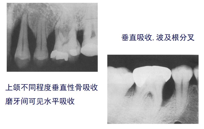 四、牙槽骨吸收的临床表现牙槽骨吸收的方式和程度,通过X线片观察,但X线显示的是近远中骨质情况,颊舌侧骨板因牙与骨质重叠而显示不清。牙周炎的骨吸收最初表现为牙槽嵴顶的硬骨板消失或嵴顶模糊。牙槽骨早期的垂直吸收,可造成与牙根之间楔形影像。