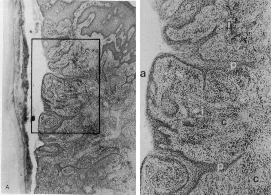 袋壁上皮钉突网状增生伸入CT图A:牙周炎内壁可见致密的炎细胞和上皮增生;图B:可见萎缩的上皮(a);和上皮增生(p),CT中炎细胞聚集(i);可见残存的CT纤维(c)。