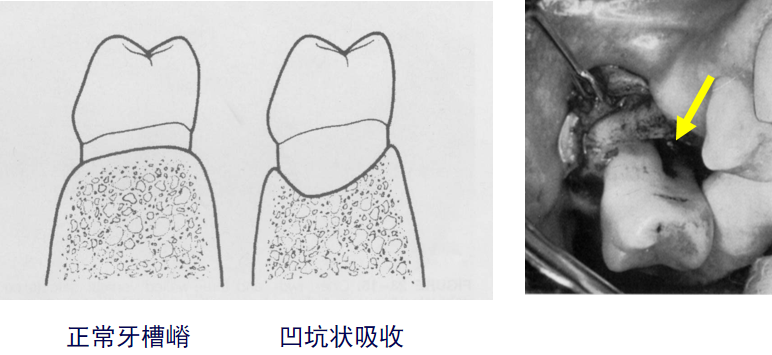 3、凹坑状吸收指牙槽间隔的骨嵴顶吸收,其中央与龈谷相应的部分破坏迅速,而颊舌侧骨质仍保留,形成弹坑状或火山口状缺损 。