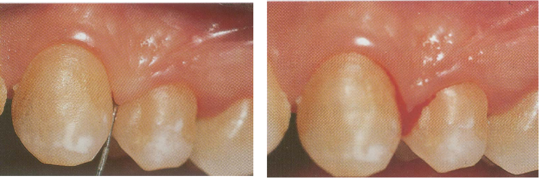 探诊深度:牙周探针探测龈沟或牙周袋的深度。附着水平:结合上皮附着于牙面的位置,健康牙龈附着水平位于釉牙骨质界处。如果附着水平向根方移位,称为附着丧失。 附着水平是否变化是区别牙龈炎和牙周炎的关键标志之一。牙龈炎:龈沟探诊深度可超过3mm,附着水平没有发生变化,称龈袋或假性牙周袋。牙周炎:探诊深度超过3mm,袋底位于釉牙骨质界的根方,附着水平向根方移位, 称牙周袋。下图(1)牙龈有退缩,探诊深度为4.5mm,附着丧失(釉牙骨质界至袋底)为6mm下图(2)探诊深度为9mm,附着丧失为6mm