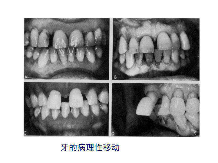 一、牙松动原因:牙槽嵴吸收; 合创伤;牙周膜急性炎症;牙周翻瓣手术后;女性激素水平变化。二、牙病理性移动 原因:牙周支持组织破坏 合力的改变。