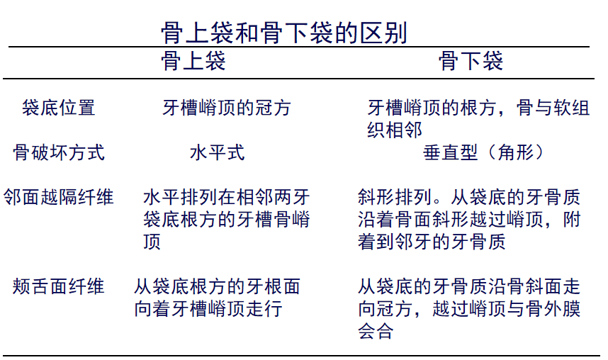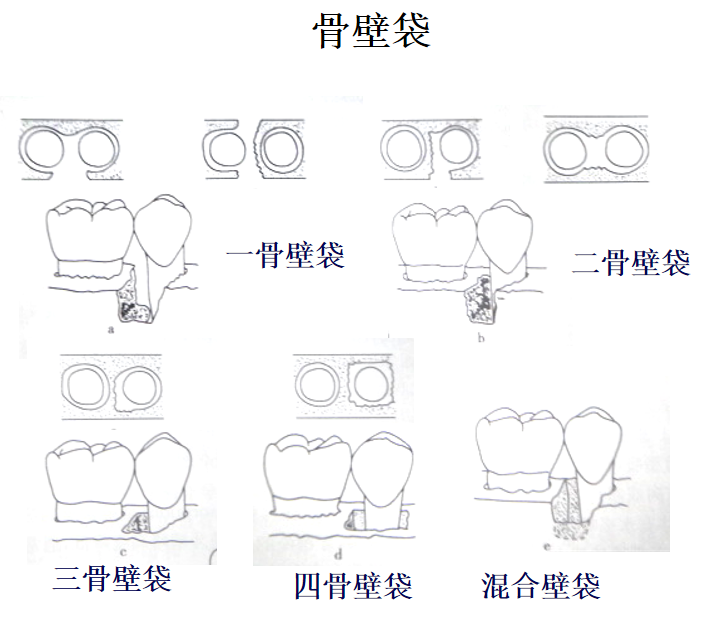 2、垂直型吸收角形吸收,牙槽嵴顶呈垂直或斜行吸收--骨下袋 骨下袋根据骨质破坏剩余的骨壁数分为一骨壁袋:牙周袋破坏严重,仅剩下一侧骨壁。二骨壁袋:骨袋仅剩下两个骨壁。三骨壁袋:袋的一个壁是牙根面,其他三面都是骨质。四骨壁袋:牙根四周均为垂直吸收形成的骨下袋,牙根孤立位于骨下袋中央,而骨壁与牙根不贴合。混合壁袋:垂直吸收各个骨壁高度不同。