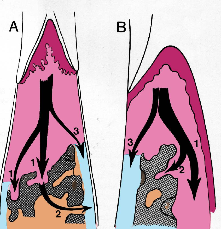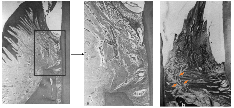 1、软组织壁袋内细菌通过袋上皮进入CT,炎细胞浸润,牙周袋结合上皮长度变短,袋内壁上皮增生, 钉突网状增生伸入CT内并向根方延伸,上皮溃疡。袋内壁有化脓性炎症。