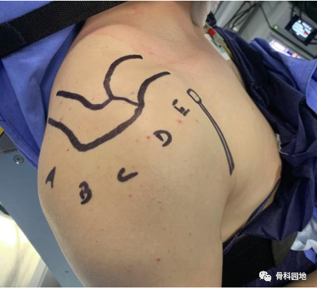 注:沙滩椅卧位,标准关节镜入口在开始手术前标记在皮肤上(A,后标准入口。B,后外侧入口。C,外侧入口。D,前外侧入口。E,前入口)