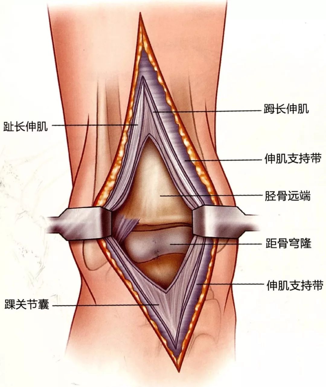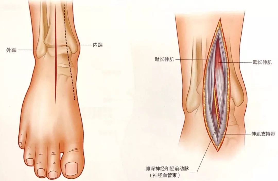表浅解剖沿皮肤切口切开深筋膜和伸肌支持带。在踝关节近端数厘米处,在𧿹长伸肌腱和趾长伸肌腱间隙之间是前方神经血管束。向内侧牵开𧿹长伸肌腱和神经血管束,向外侧牵开趾长伸肌腱。