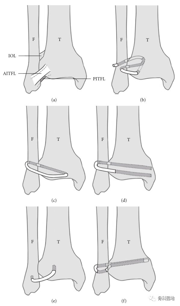 注:在胫骨前外侧和腓骨前外侧分别建立了 2 个骨隧道(直径 5.5 mm;深度 25 mm),分别是 AITFL 的起点和终点。 使用螺钉固定 2 根管中的自体股薄肌腱。T:胫骨;F:腓骨;AITFL:前下胫腓韧带;IOL:骨间韧带;PITFL:后下胫腓韧带;灰线:移植物。
