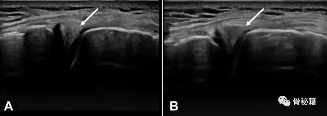 动态超声图像。(A) 休息时没有半月板挤压(箭头)。(B) 内翻应力测试显示内侧半月板挤压(箭头)