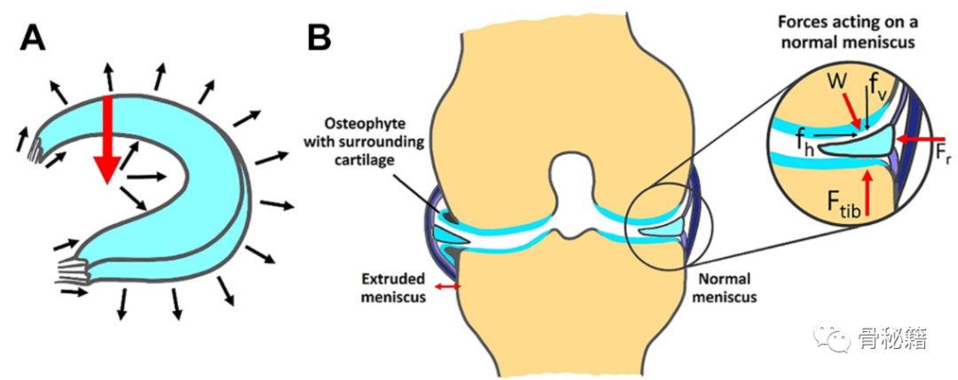 生物力学研究表明,作用在伸展膝关节上的大约 40% 到 60% 的负荷被传递到半月板(65%-70% 外侧和 40%-50% 内侧),并且这在屈曲时增加高达 90%。当膝关节承受负荷时,会产生压缩力、拉伸力和剪切力,其中一些会转化为环向应力