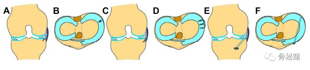 半月板挤压修复技术的说明。(A) 冠状和 (B) 轴向基于锚定的集中技术。(C) 冠状和 (D) 轴向半月板韧带修复。(E) 冠状和 (F) 轴向经骨集中拉出缝合技术。