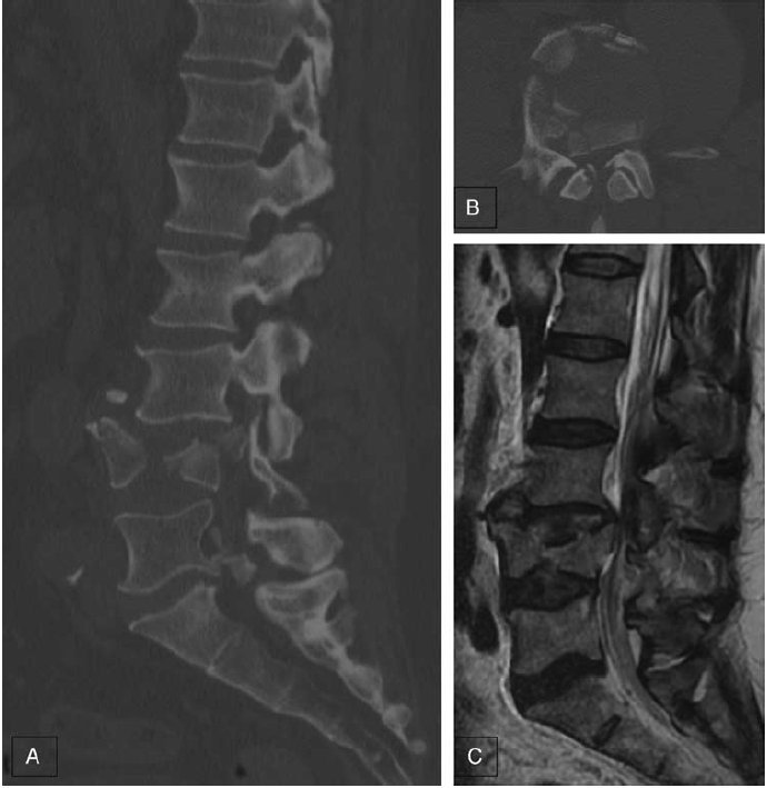 A, 三维CT矢状位示L4爆裂骨折三柱均有损伤;B, L4轴位图示骨折导致椎管内骨性狭窄;C,矢状位t2加权磁共振成像显示骨折碎片向后突入椎管。