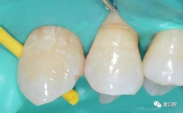 图8:24 同样制作树脂突 翻转橡皮障,我们可以看到缺损完全暴露出来了