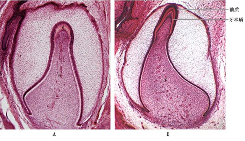 在钟状晚期,首先在牙切缘处,形成了一层牙本质,然后,成釉器中的内釉细胞在牙本质的诱导下,在其表面形成了釉质,本质与釉质相互交叉形成,就如图2所示。