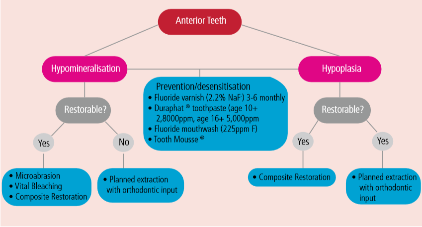 矿化不全和形成不全的牙齿表现出一系列的临床变异性。白色、黄色的不透明斑块、釉质软而多孔,矿化程度低,并且影响粘接,是矿化不全的特点。而釉质表面窝状、沟状凹陷、质硬、釉质量少,是形成不全的特点。基本了解了这两种疾病之后,下一步考虑的就是治疗方案。这是文献中推荐的儿童牙科的治疗方案选择路径图。当然,我们也可以从中得到一些启示。对于前牙(图6),如果牙齿无症状,并且患者没有美学问题,则无需进行任何治疗。对于矿化不全,我们要考虑到:有时很难用复合树脂直接粘合到矿化度差的牙釉质牙齿上的。除此之外,矿化不全的牙齿通常是正常的形状和大小,因此需要通过牙体预备来获得正常的牙齿轮廓和形态的修复空间。因此,包括牙齿漂白和微打磨、渗透树脂在内的保守治疗应始终被视为首要考虑的方案。但是,对于釉质形成不全,牙齿看起来可能更小而影响美观。复合树脂通常不需要进行任何牙体预备即可使牙齿恢复其正常形态,因而被推荐为首选。当然,贴面等比较微创的方式,也是可选的。