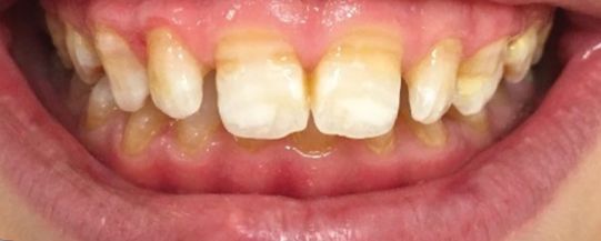 显示的是影响前牙的弥漫性不透明的釉质,以及局部的着色