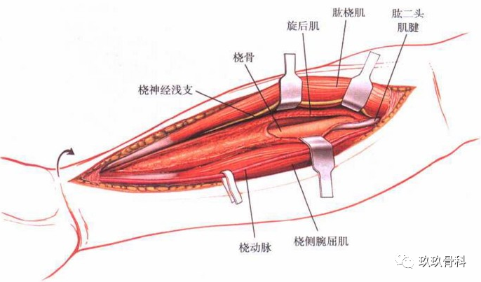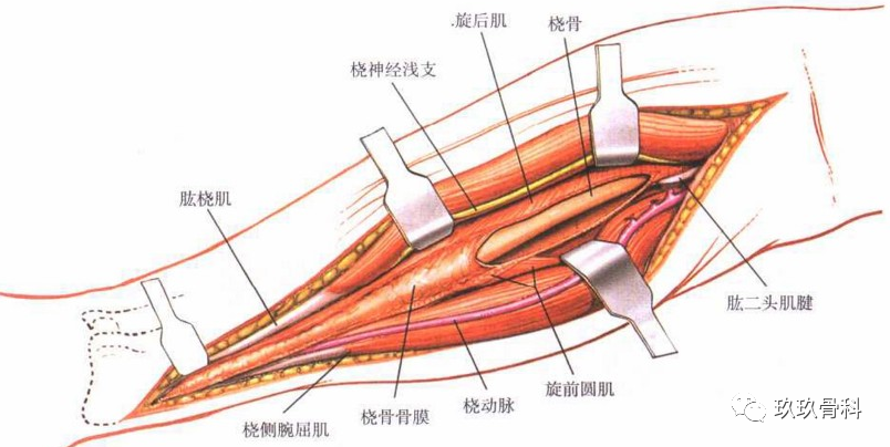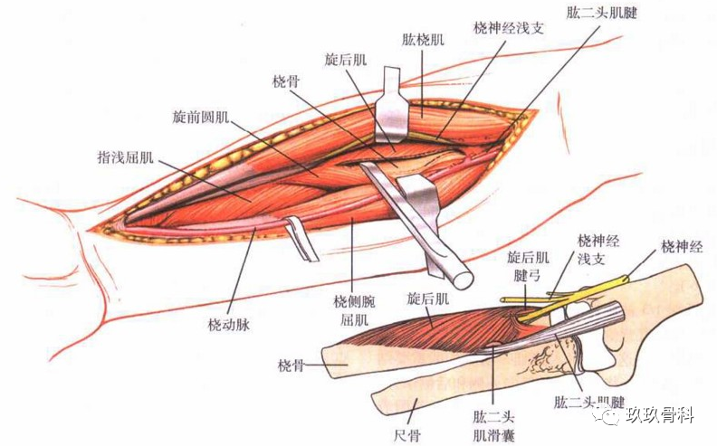 # 神经骨间后神经在旋后肌内围绕桡骨颈走行,因此最容易受损伤。确保安全的关键是正确地从桡骨旋后肌的止点处剥离下此肌肉。只有当前臂充分旋后,旋后肌的止点才能充分显露。一旦开始骨膜下剥离,骨间后神经就相对安全了,但过度牵拉仍可引起神经的功能性麻痹(见图4-7)桡神经浅支在前臂走行于肱桡肌的深面,游离并向外侧牵开由3块肌肉组成的“三合一活动块”时容易受损(见图4-5)。如果过度牵引,桡神经浅支也可发生功能性麻痹。因此术中牵拉神经时一定要小心,术前要告诉患者术后早期可能会出现桡神经浅支皮肤支配区暂时性的感觉异常。