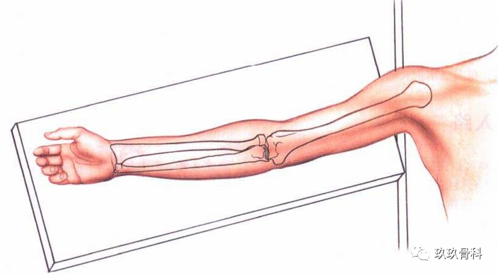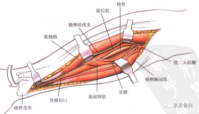 图4-10前臂部分旋后,将拇长屈肌和旋前方肌从桡骨上牵开,充分显露桡骨近端至远端。