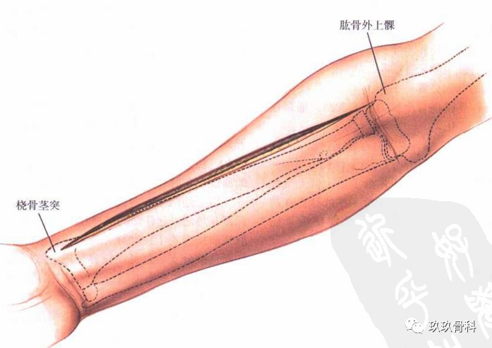 # 切口自肱二头肌腱外侧的肘屈侧皮肤横纹、向下直至桡骨茎突,作一直切口,切口长度视手术需要显露的程度而定(图4-2 )。