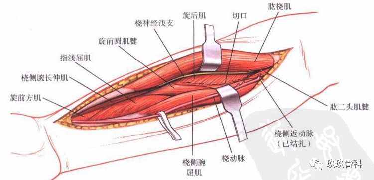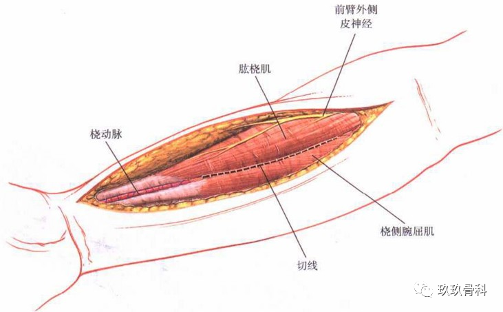 - 2.在切口近端,桡动脉走行在肱二头肌腱的内侧。为避免在该部损伤桡动脉,手术要在肱二头肌腱的外侧进行。