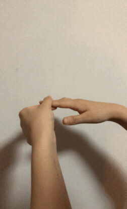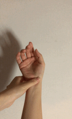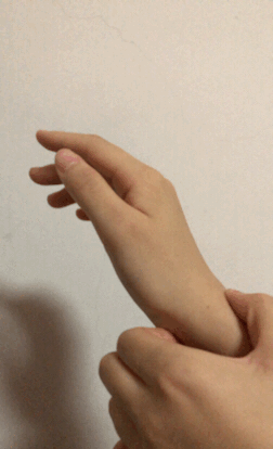 (2)右手腕屈曲的时候,左手拇指和食指捏住右手手腕的上面一排的小骨头,往相反方向轻推,同样听见“喀哒”一声即可。