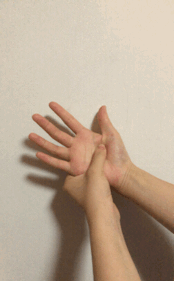 左手大拇指按顺时针方向按揉右手掌心,从食指的位置开始依次向小指的方向按揉。