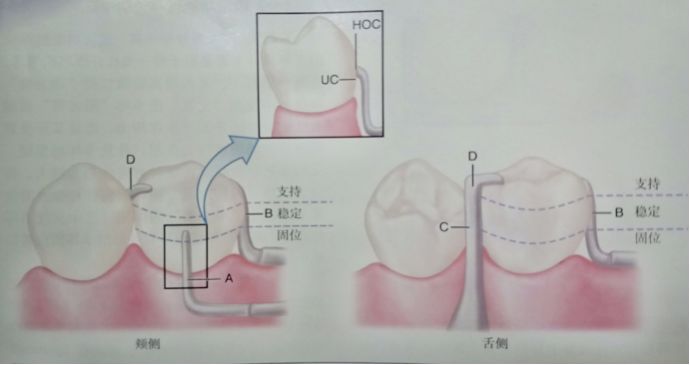 图3:A.颊侧固位臂(稍向牙合方延伸以提供稳定作用,见插图,HOC为外形高点,UC为倒凹);B.远中邻面板;C.小连接体;D.近中牙合支托