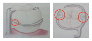 6、卡环的固位臂尖最好位于基牙牙冠的龈1/3(图2A:圆圈处),对抗臂应位于牙冠的龈1/3与中1/3交界处(图2B)。