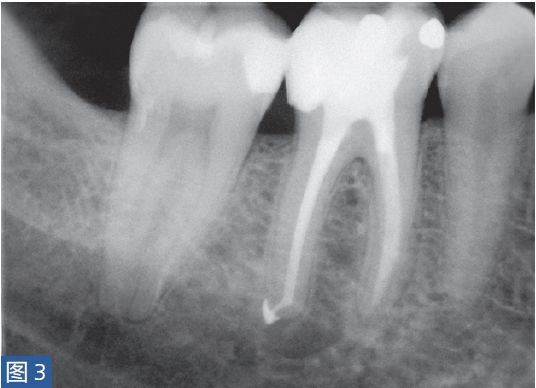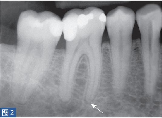 图2:46 牙齿SAP。术前X 线片,该牙齿在其他医生处已行龋齿治疗。患者诉牙齿有明显的咬合痛以及强烈的冷热刺激敏感症状。放射学检查,近中根根周膜间隙略增宽。