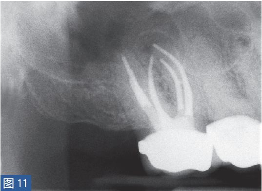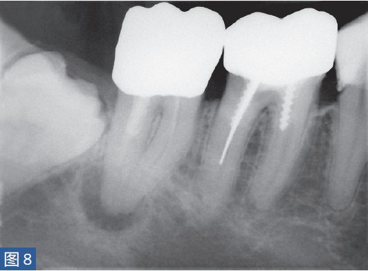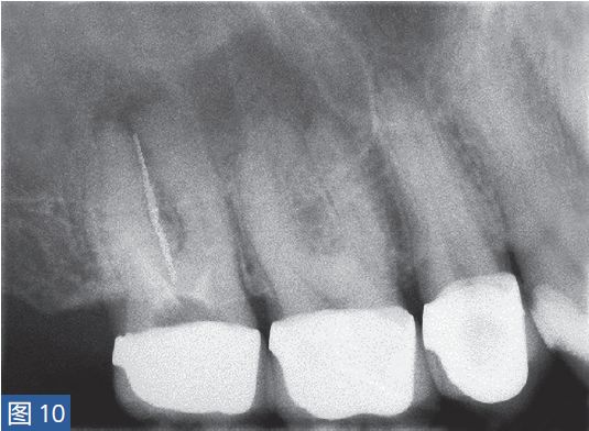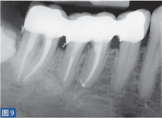 图9:47 牙齿AAA。根管治疗后。患者在其家庭牙医处做临时义齿修复12 个月后的检查。