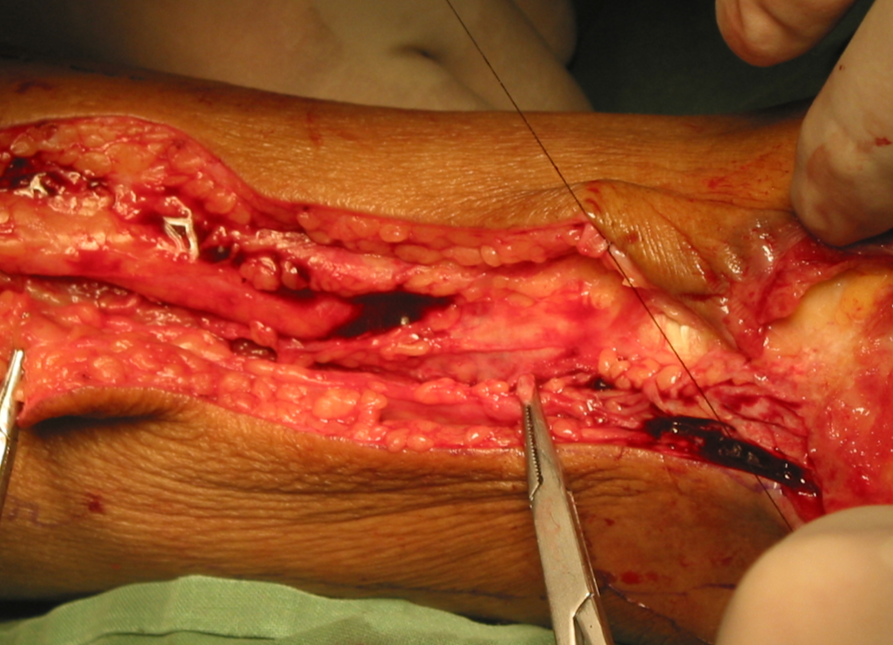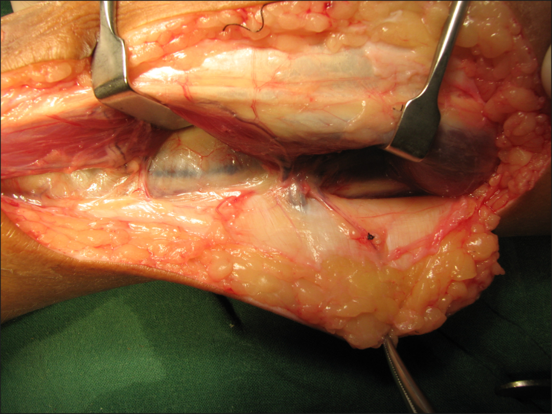 2、先切取皮瓣的前中下缘,紧靠胫骨的后内侧缘(内踝上皮支)。