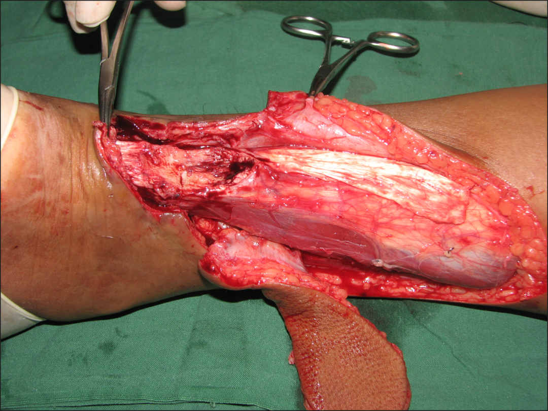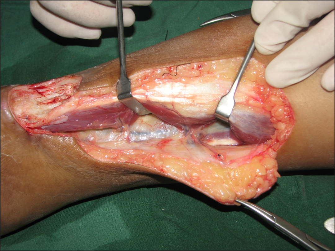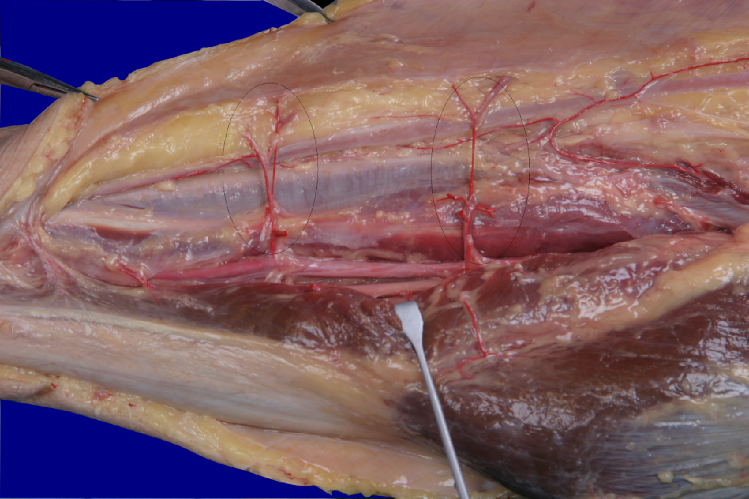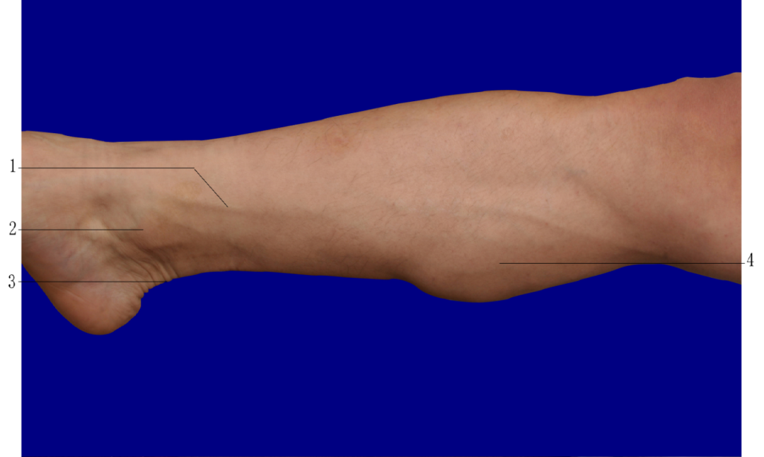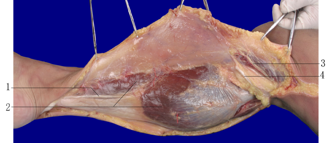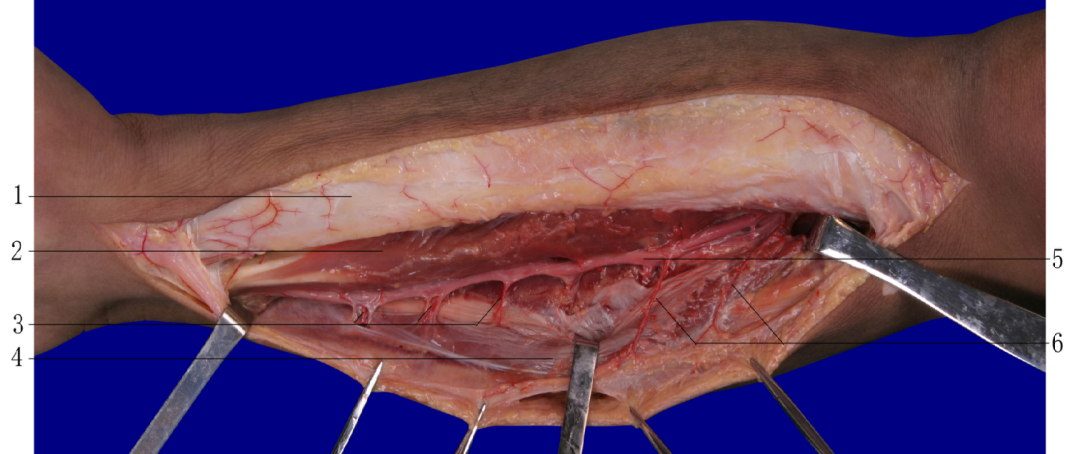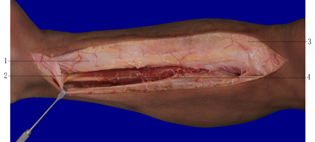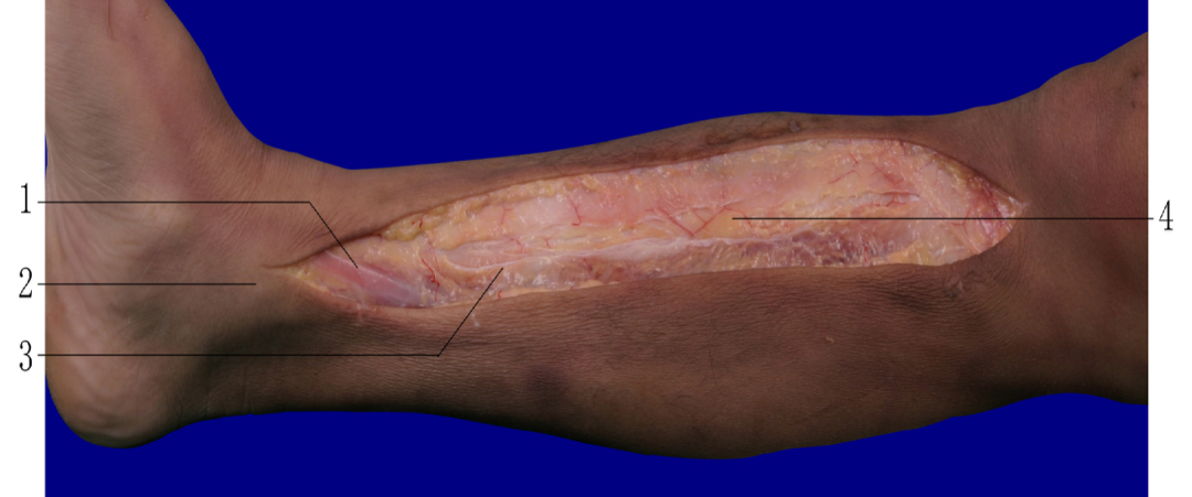 3、深筋膜下,趾长屈肌与比目鱼肌间隙为皮瓣的皮支穿出点。