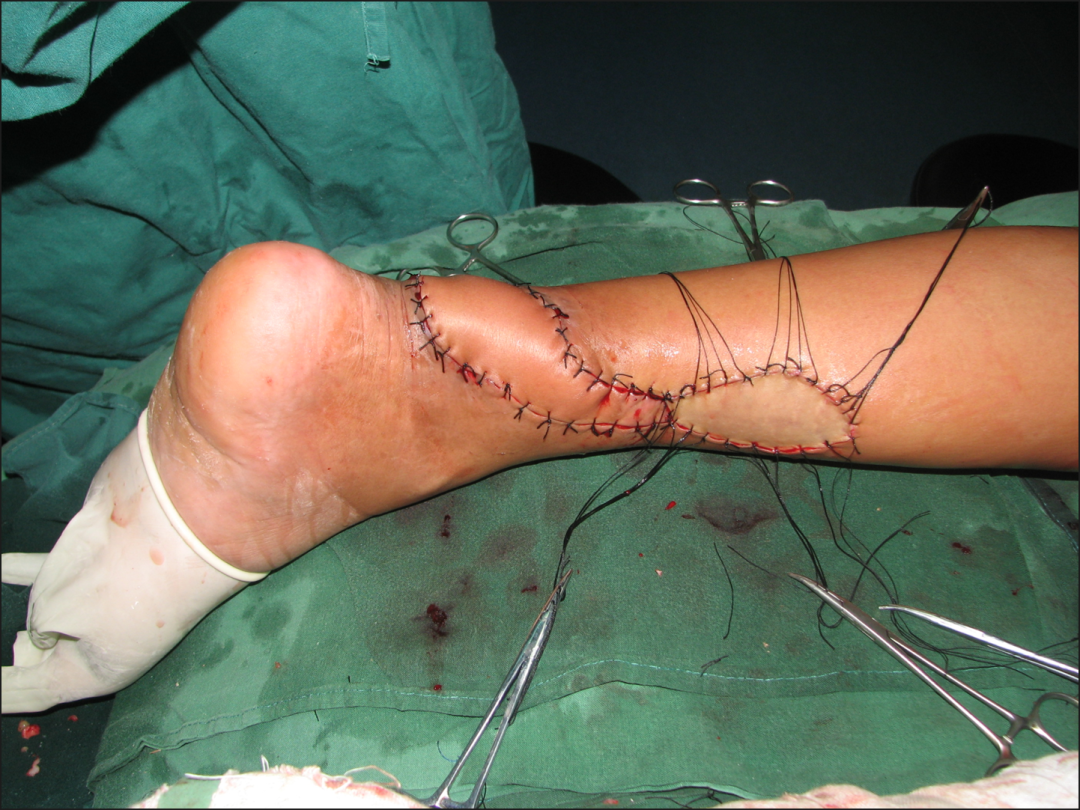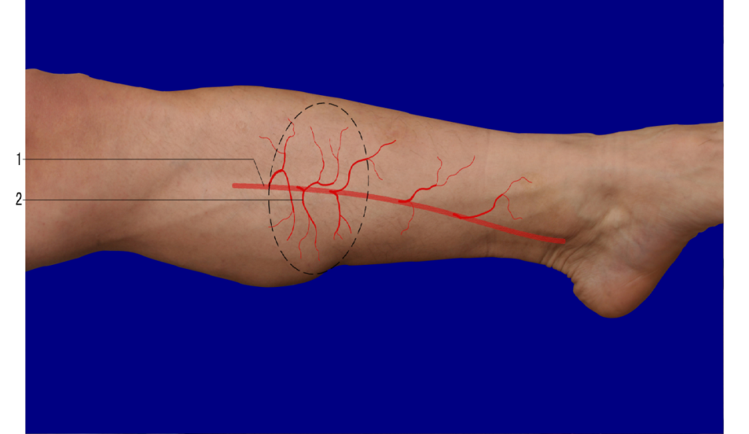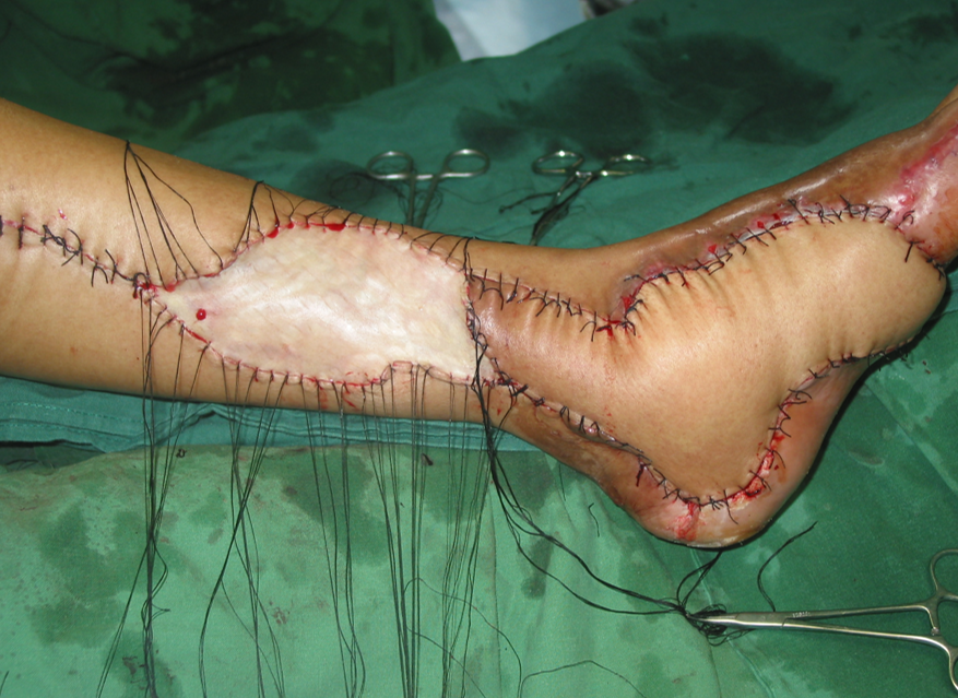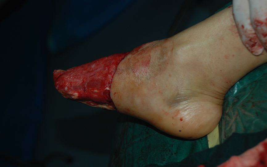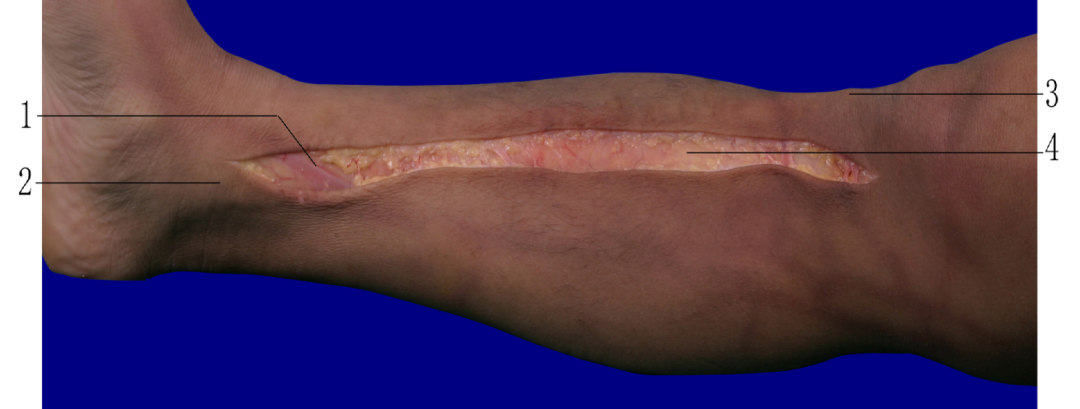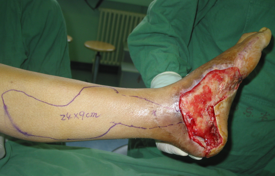 1、顺行或逆行转移可修复小腿任何部位的皮肤缺损,尤其适用于膝、腘窝、足跟、足底、踝部、中足足背、跟腱部位皮肤缺损