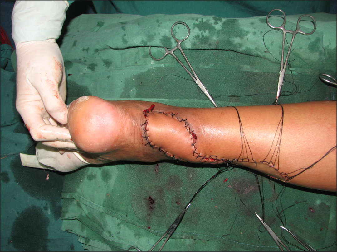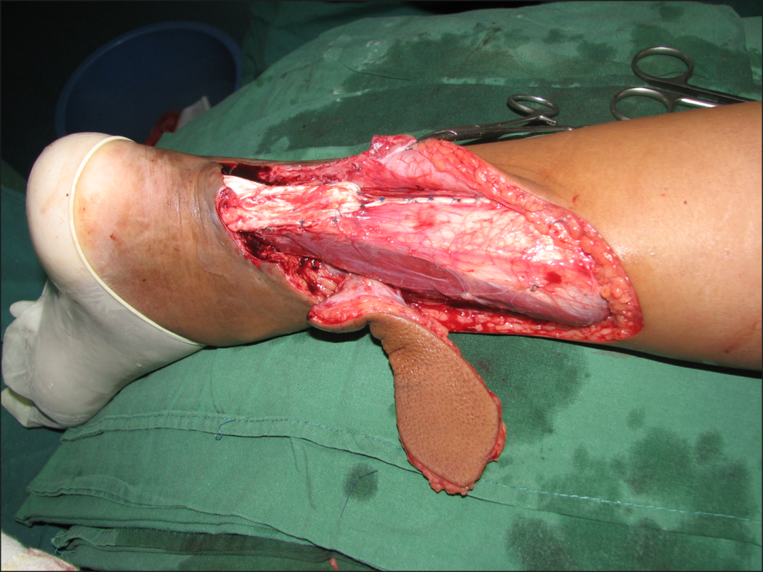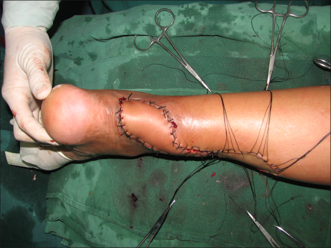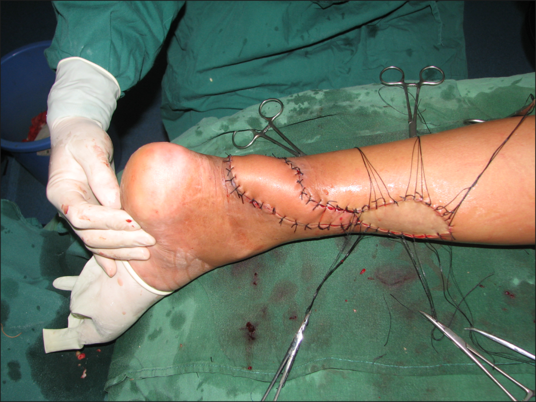 1、顺行或逆行转移可修复小腿任何部位的皮肤缺损,尤其适用于膝、腘窝、足跟、足底、踝部、中足足背、跟腱部位皮肤缺损