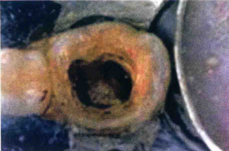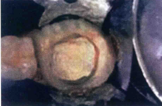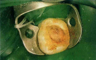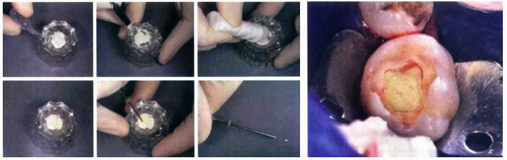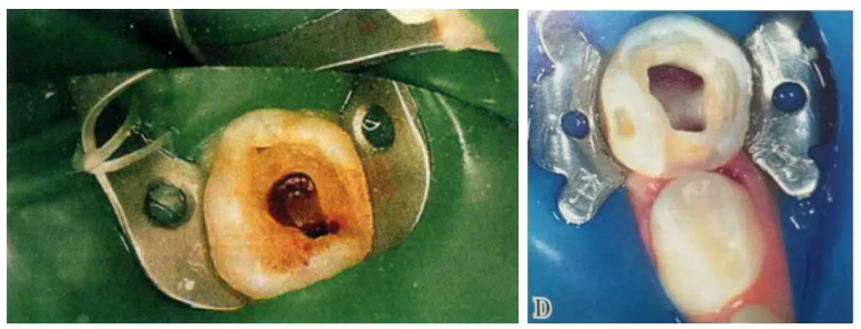 3.取出小棉球,根管口看起来类似“黑眼睛”,无出血。随后髓室内填入稠的氧化锌丁香油糊剂(ZOE)或临时性修复材料,然后根据剩余牙体组织的结构选择合适材料恢复牙齿形态。