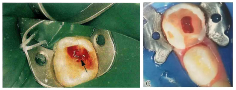 4.在大量水雾下用球钻暴露髓腔,揭髓顶,观察牙髓状态(形态、出血量、颜色)。
