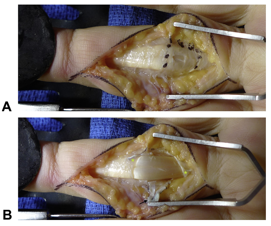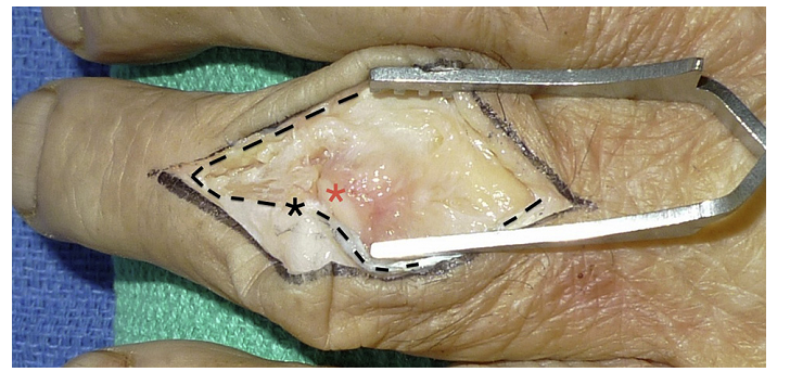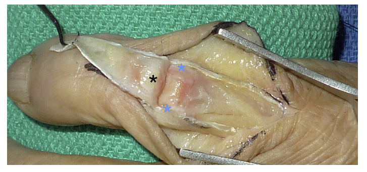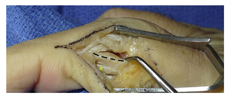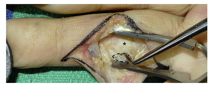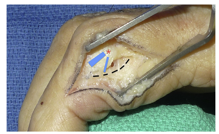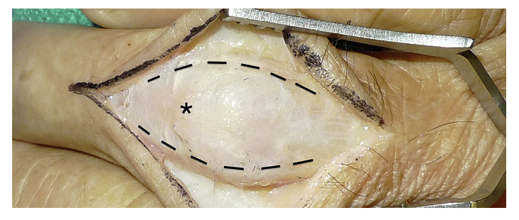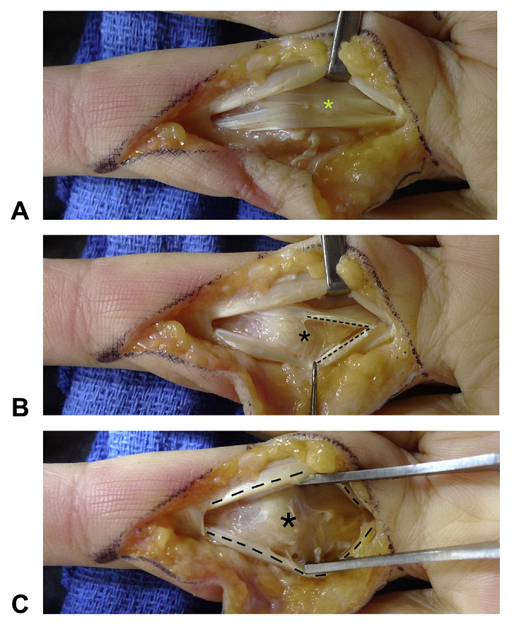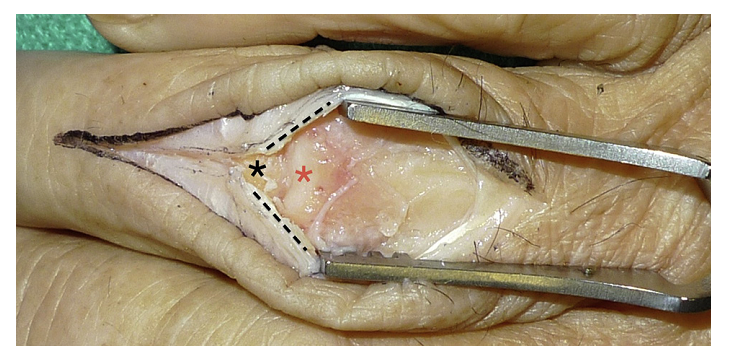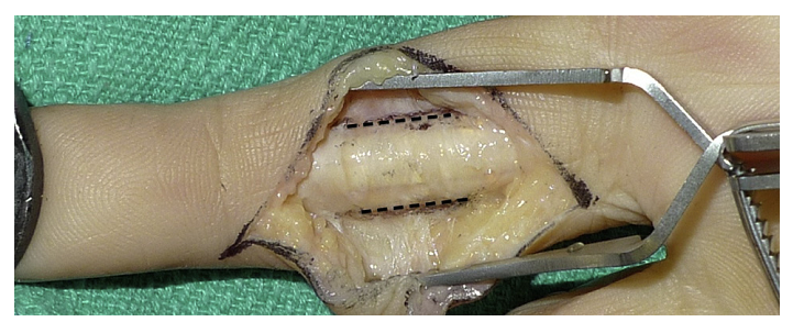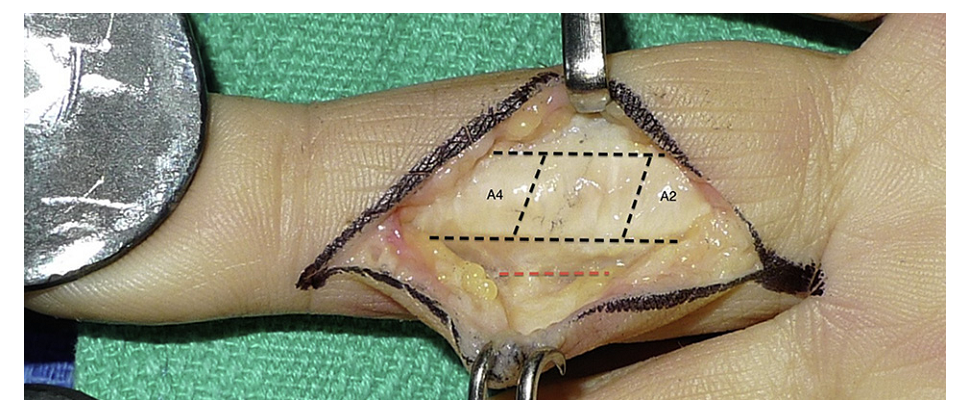 Simmen等人提出了另外一种处理腱鞘的方法,将A2-A4之间的腱鞘两侧(下图虚线)切开,随后将肌腱连同腱鞘一同牵开。