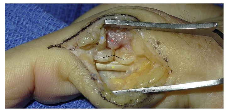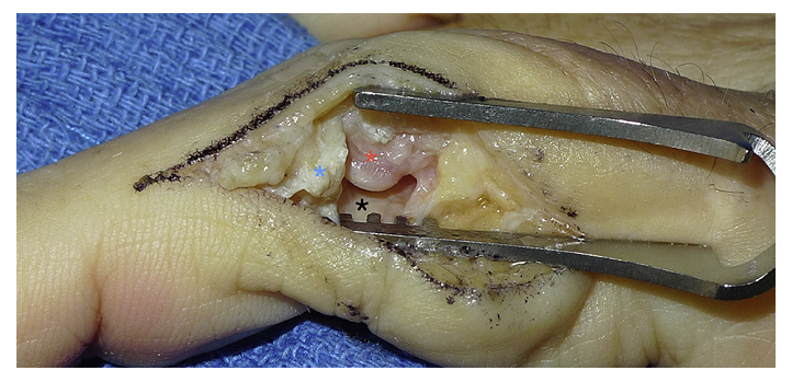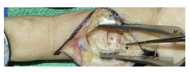 沿中线纵行切开伸肌腱,此处黑星和红星分别标注中央束止点和近节指骨头。