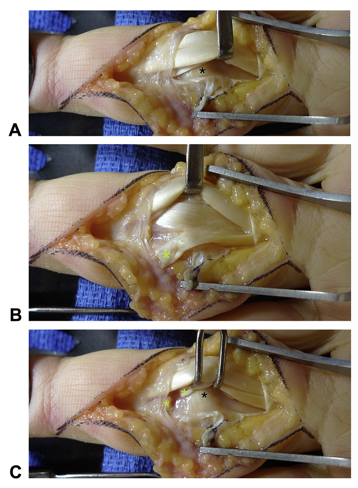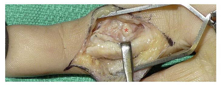 也可将指深屈肌腱牵向一侧,自指浅屈肌腱两束之间进入,可显露掌板。该方法需要部分切开指浅屈肌的Camper交叉。