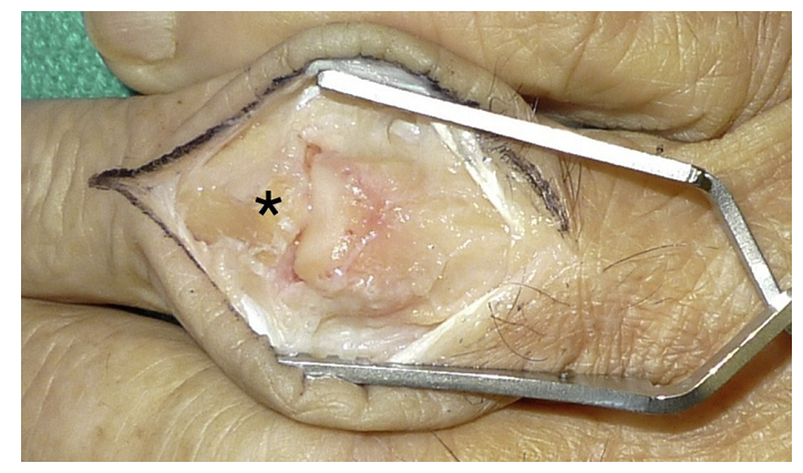三角形肌腱可向远端掀开,可显露近节指骨远端和侧副韧带。手术完成后修复V形切开的肌腱即可。