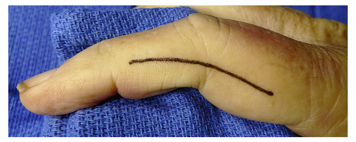 侧方入路:该入路可用于关节置换或骨折内固定手术。切口自手指侧方,近节指骨、中节指骨中点之间。
