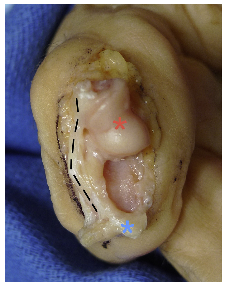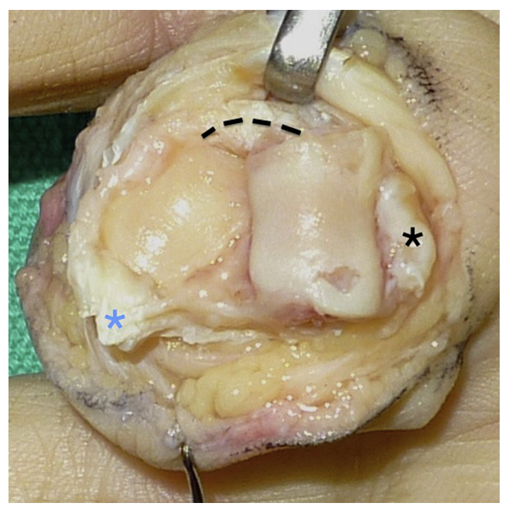 黑虚线为完整的侧副韧带,蓝星为切断的侧副韧带,黑星为掀起的掌板