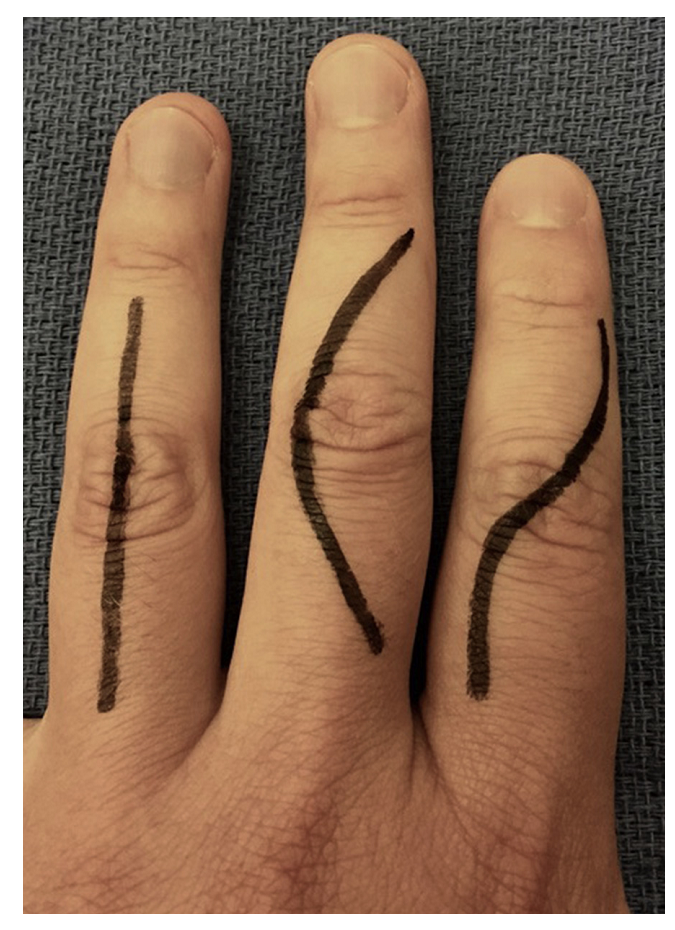 掌侧入路:用于关节置换、掌板修复、骨折内固定等手术,包括Bruner入路、Bruner-外侧混合入路、Z字切口入路(见下图)。与Bruner入路相比,后两个入路显露范围更大一些。