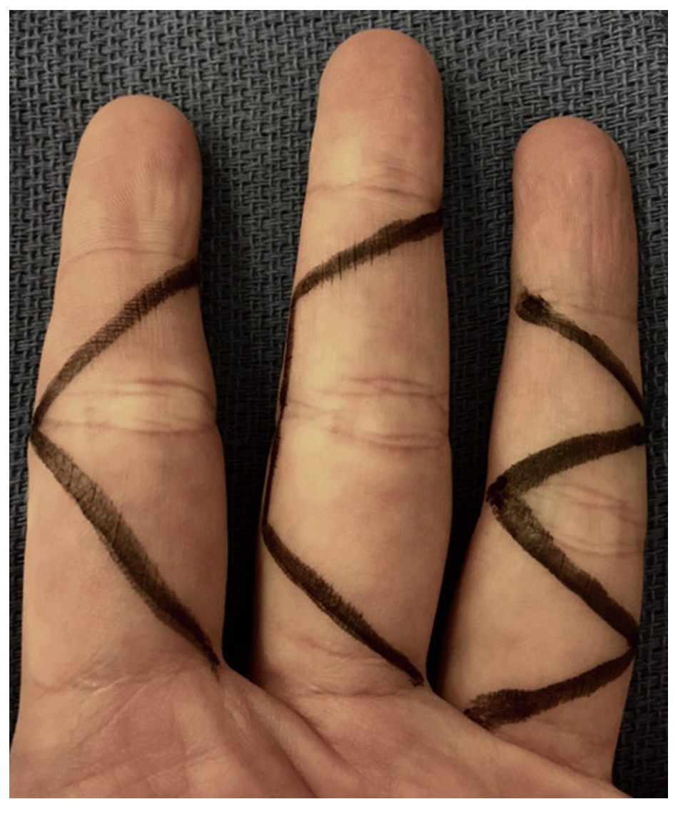 将掌板向近端或远端掀起,即可显露近位指间关节。