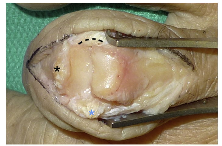 上述方法在手术完成后,需要将中央束重新固定于中节指骨基底。Linscheid等人提出了另外一种方法,于伸肌腱近端V形切开,如虚线所示: