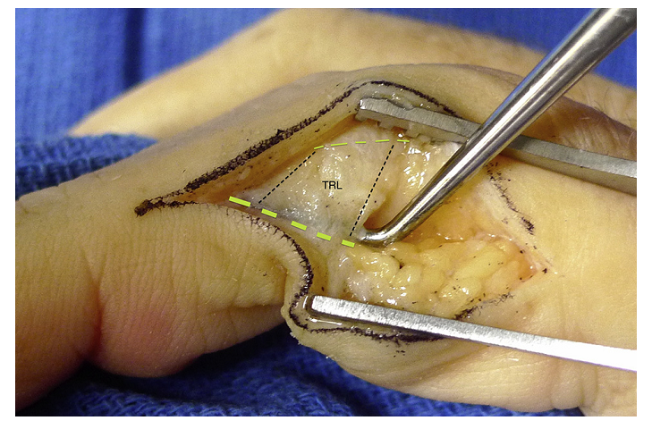 切开皮肤及皮下组织即可显露出横行支持带(TRL,transverse retinacular ligament),该支持带在关节处覆盖在近位指间关节侧方,起自屈肌腱鞘,止于伸肌腱的外侧束。其具体范围可见下图所示。