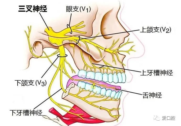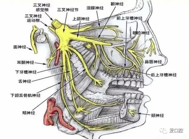 下颌神经为混合神经,是三支中最粗大的分支。自三叉神经节发出后,经卵圆孔出颅腔达颞下窝,立即分为许多支。其中特殊内脏运动纤维支配咀嚼肌。一般躯体感觉纤维分布于下颌各牙、牙龈、舌前2/3和口腔底粘膜以及耳颞区和口裂以下的面部皮肤。